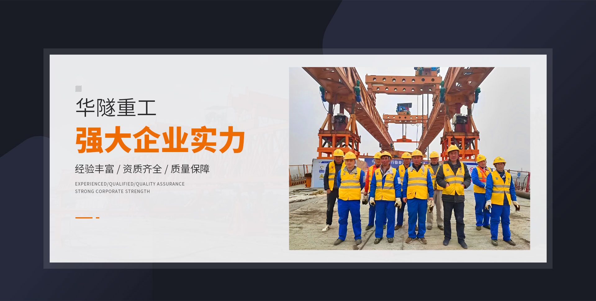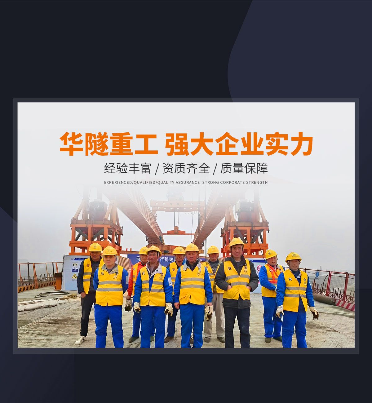 河南華隧重工機械裝備有限公司主要從事通用門式起重機、橋式起重機、電動單梁起重機,輪胎式起重機、架橋機、提梁機、遠梁平車、鋼絲繩電動萌蘆、卷揚機、起重配件制造、銷售:起重機械租賃、安裝和維修,起重設備園收,機械設備維修,鋼結構工程承包,橋梁工程及技術咨淘服務,銷售五金制品、機電設備:建設工程監理,建設工程設計,各類工程建設活動,建筑勞務分包,建筑物折除作業,施工作業,工程管理服務,土石方工程施工,裝如發運。  公司已通過IS0國際質量、環境、健康與安全三合一標準認證,特種設備制造許可證和特種設備安裝改造維修許可證。擁有完熟的質量管理體系。嚴格的管理制度,強大的生產能力和先進的檢測手段,在保證產品質量的同時,也具備了極強的市場競爭力?! 」緢猿挚萍紕撔聻槔砟?,產品質量為核心,注重信譽,建立了減信可靠、快捷、思速。便利周到的售后服務網絡。  我們擁有的技術專家和技術服務隊伍為客戶提供充善的售前技術支持和全天候的售后服務體系,讓您無后顧之憂,享受一站式的超值服務?!  叭A隧重工,伴您成功“是華隧重工永遠的宗指,真被的希望與各界朋友攜手并進。共創輝準!